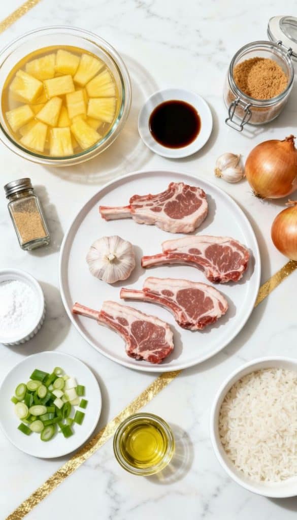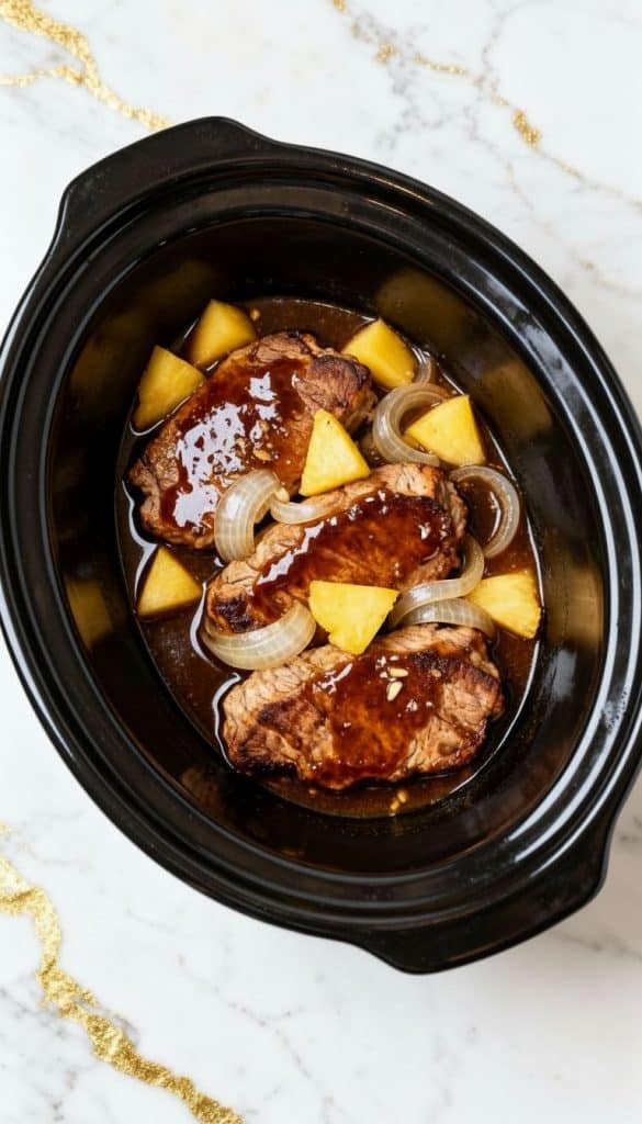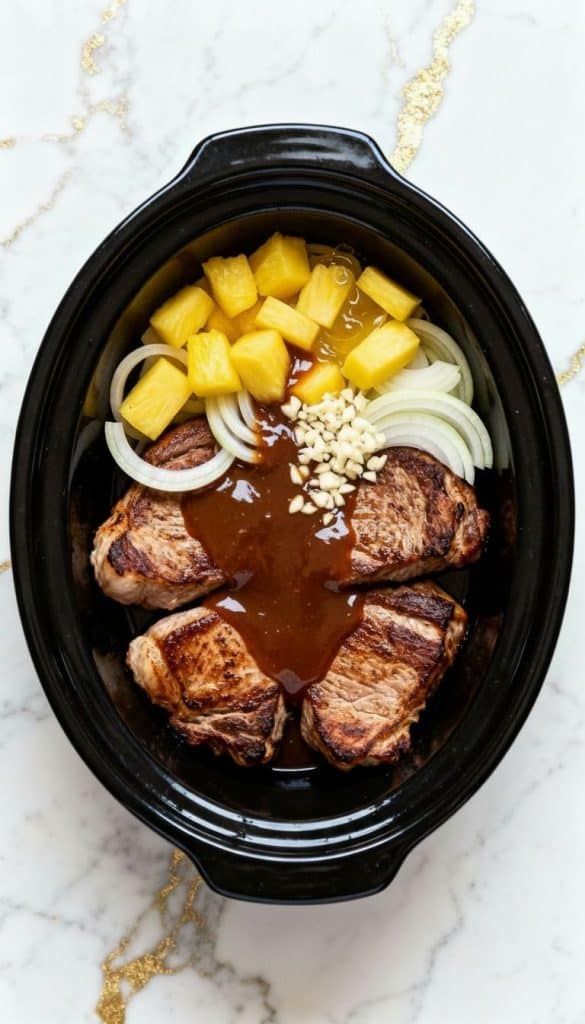 Place the seared pork chops into the bottom of the black oval slow cooker. Pour in the entire can (20 oz) of pineapple chunks with juice, add sliced onion and minced garlic. In a small bowl, mix 1/2 cup soy sauce, 1/4 cup brown sugar, 1 tablespoon cornstarch, and 1/2 teaspoon ground ginger. Stir well and pour over everything in the slow cooker.