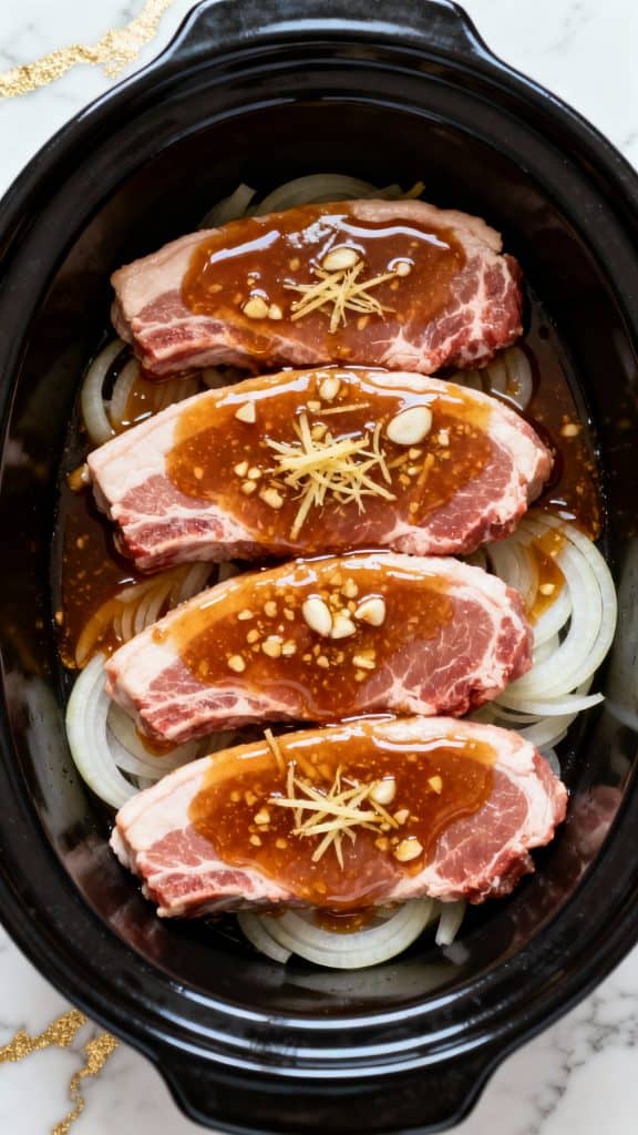 Pour the mixed sauce evenly over the pork chops in the slow cooker, making sure the tops are fully coated.