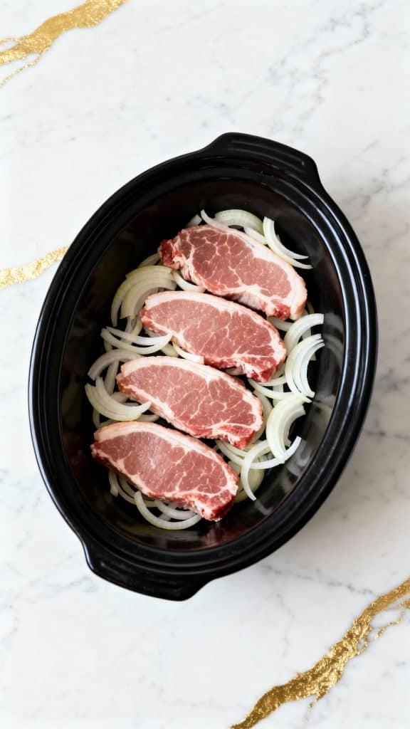 Place 4 boneless pork chops (1 inch thick) into the black oval crockpot. Add ½ onion, thinly sliced, spreading over and around the pork chops.