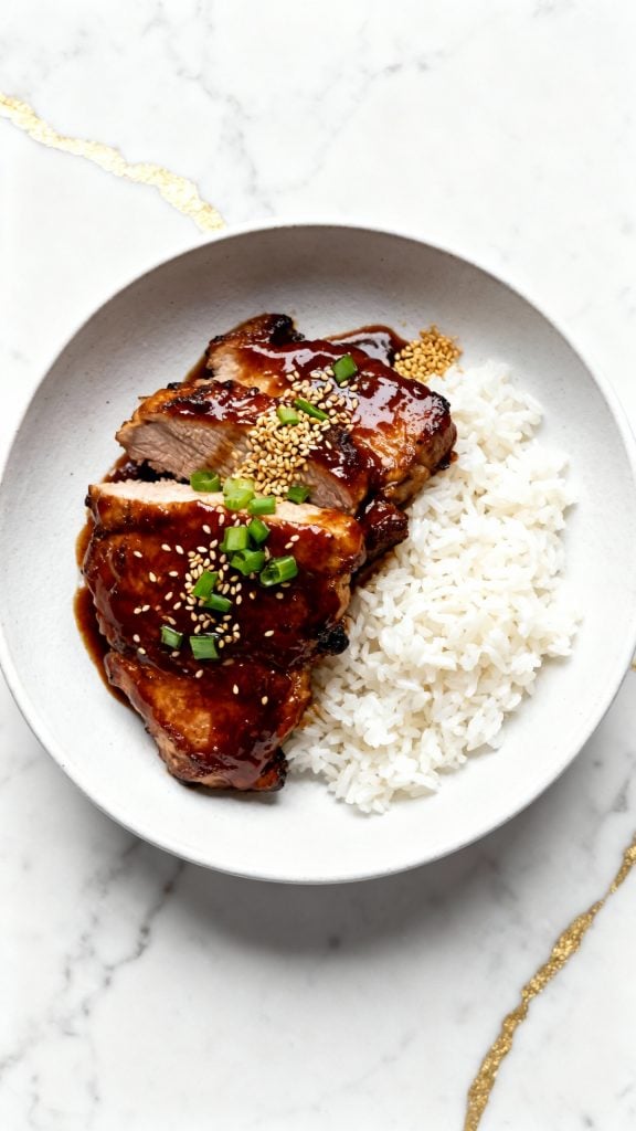 Return the pork chops to the crockpot, pour the thickened sauce over top, and let sit for 5–10 minutes to soak up flavor. Serve over rice and garnish with sesame seeds and chopped green onions.