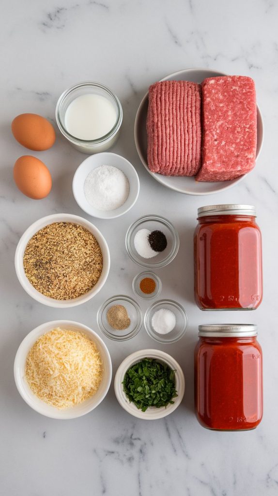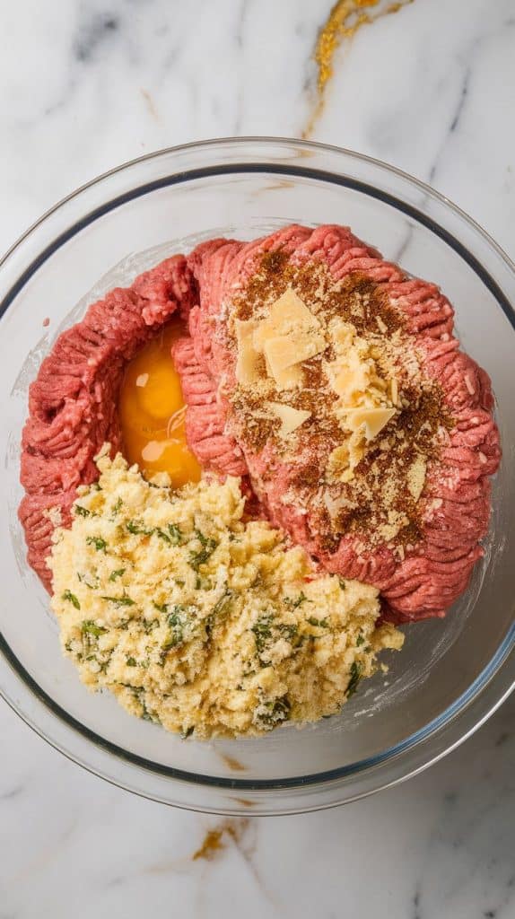 In a large bowl, combine 1 lb ground beef, 1 lb ground pork, 2 large eggs (lightly beaten), the soaked breadcrumb mixture, ⅓ cup grated Parmesan, ¼ cup chopped fresh parsley, 4 cloves garlic (minced), 1 tsp salt, ½ tsp black pepper, 1 tsp onion powder, and 2 tsp Italian seasoning. Mix until just combined.