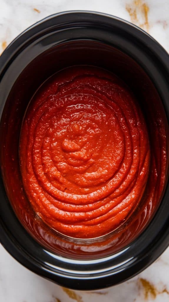Pour one jar (24 oz) of marinara sauce into the bottom of the slow cooker.