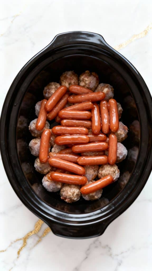 Add 14 oz of cocktail smokies on top of the frozen meatballs. Spread them out evenly.