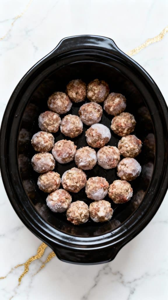 Pour 24 oz frozen homestyle meatballs straight into the black oval crockpot. They should still be fully frozen.