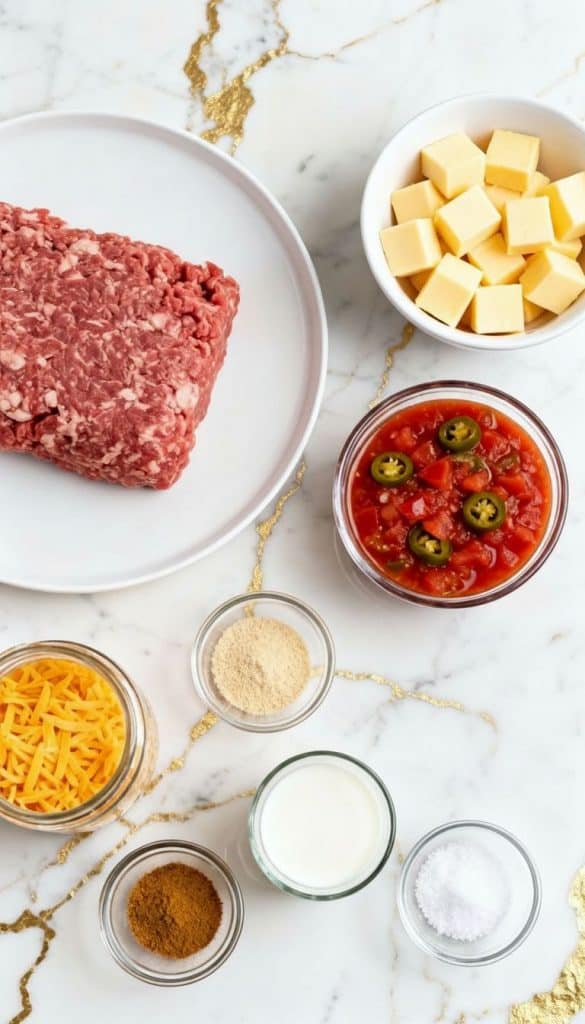 To your black oval crockpot, add the browned ground beef, 16 oz cubed Velveeta cheese, 1 can diced tomatoes with green chiles (undrained), 1/2 cup whole milk, 1/2 cup shredded cheddar cheese, 1/4 tsp garlic powder, 1/4 tsp onion powder, 1/4 tsp cumin, and 1/4 tsp salt.