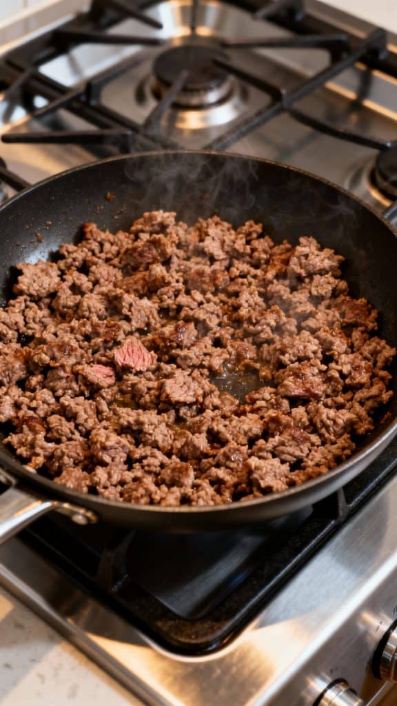 In a large skillet over medium heat, cook 1 lb ground beef until fully browned and no longer pink. Break it up with a spoon as it cooks.
