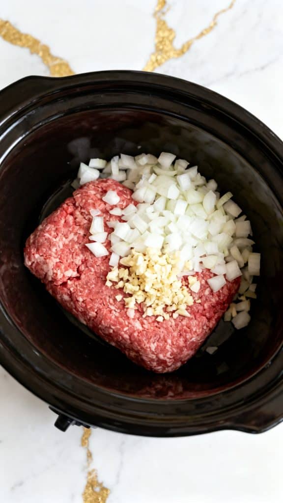 Add 1 diced onion and 3 cloves minced garlic on top of the raw ground beef.