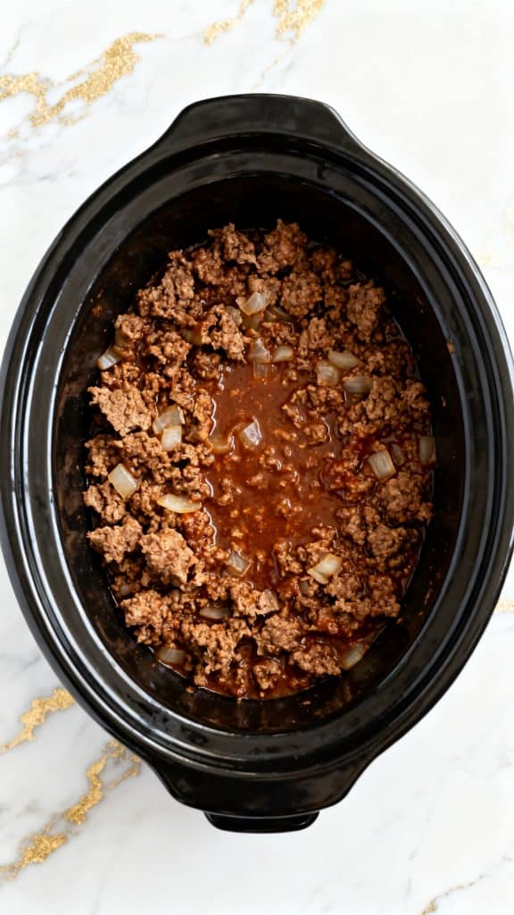 Place 2 pounds of raw ground beef into the black oval crockpot.