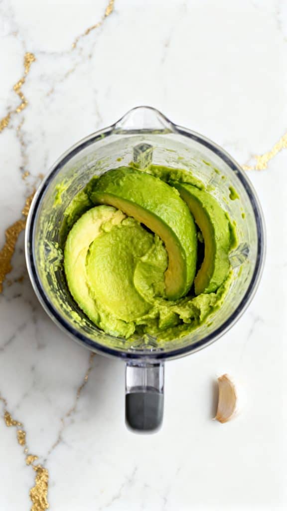 Cut 1 ripe avocado in half, remove the pit, and scoop the flesh into the blender. Peel 1 small clove of garlic and toss it in.