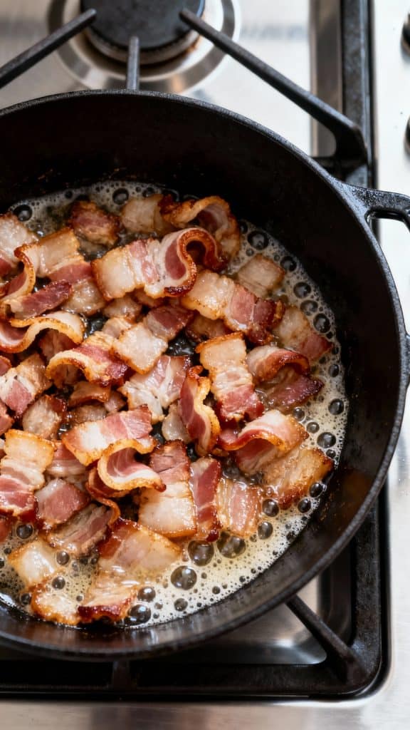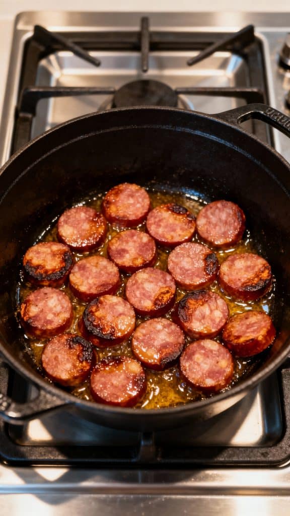 Use a slotted spoon to remove the bacon, leaving the grease. Add 1 lb of sliced smoked sausage into the bacon fat. Sear until browned on both sides, about 5–6 minutes.