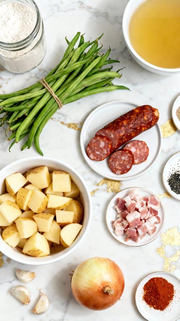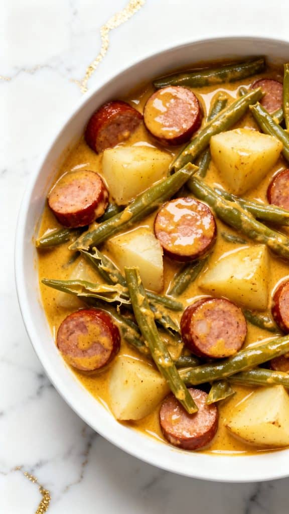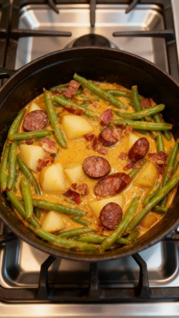 We’re talking smoky sausage, crispy bacon, fresh green beans, and tender potatoes — all cooked down in a thick, savory gravy that smothers every bite.