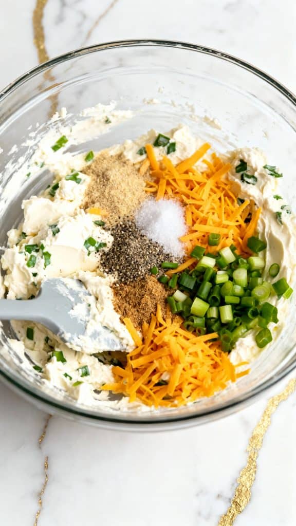 In a large bowl, add 16 oz softened cream cheese, 2 cups shredded sharp cheddar cheese, 1/2 tsp garlic powder, 1/4 tsp onion powder, 1/4 tsp salt, 1/4 tsp black pepper, and 1/4 cup finely chopped green onion. Mix with a spatula until everything is smooth and fully combined.