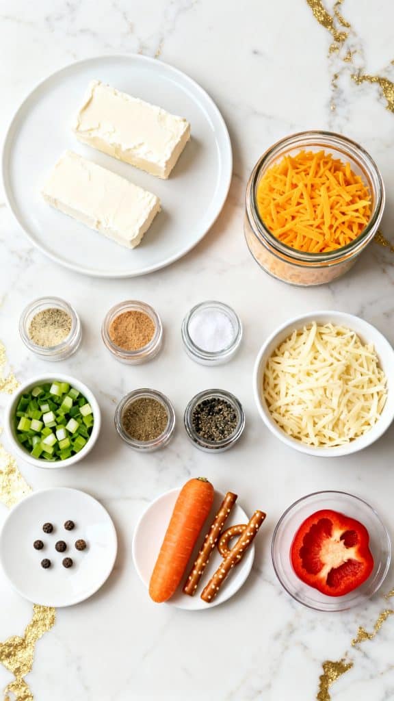 Cream cheese gives the cheese ball structure and creaminess. Shredded cheddar adds richness and sharpness. Garlic and onion powders add savory depth without overpowering. The green onion adds a fresh bite. Shredded mozzarella is light in flavor and clings well, making it perfect for the snowy look. Decorations are edible and fun but don’t change the flavor.