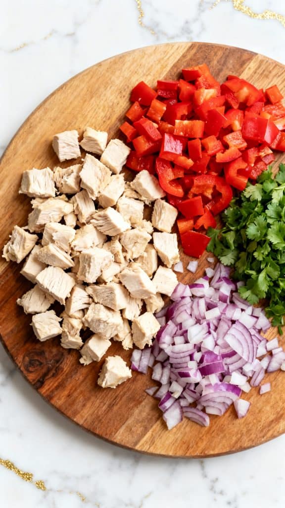 Dice 2 cups cooked chicken breast, 1 red bell pepper, and 1/3 cup red onion into small even pieces. Chop 1/4 cup fresh cilantro.