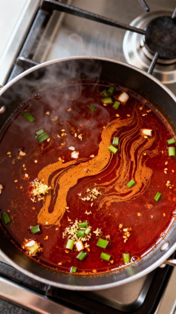 In a pot, sauté 2 cloves minced garlic, 1 tsp grated ginger, and 1 tbsp chopped green onion in 1 tsp sesame oil for 1 min. Add 4 cups chicken broth, 1 tbsp miso paste, 1 tbsp soy sauce, and 1 tbsp chili garlic sauce. Simmer 10 min.