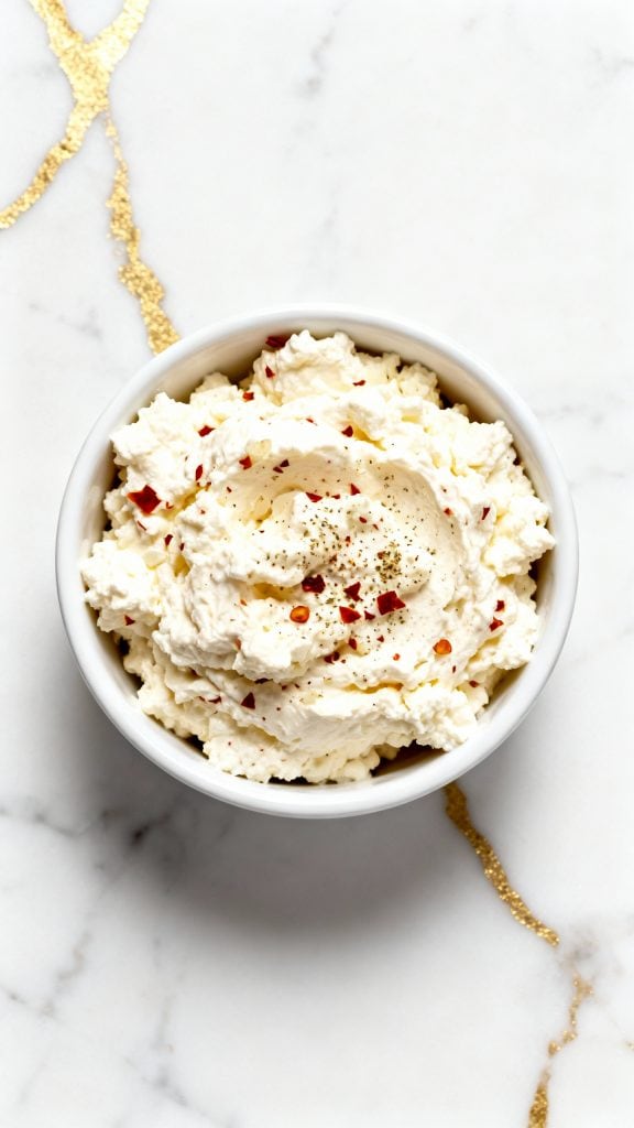 In a small bowl, mix ½ cup cottage cheese with ½ tsp red pepper flakes, ¼ tsp garlic powder, and a pinch of salt and black pepper.
