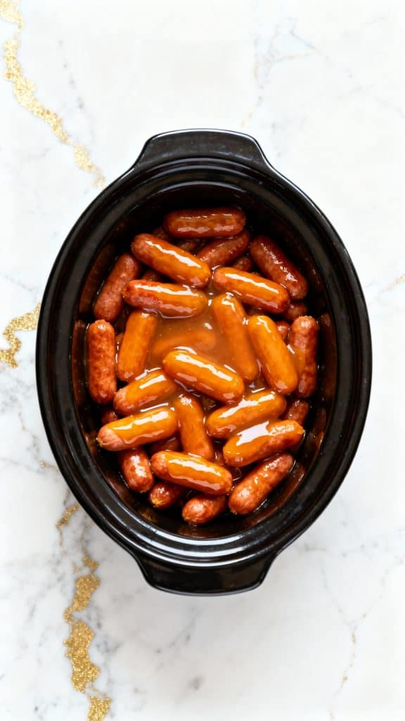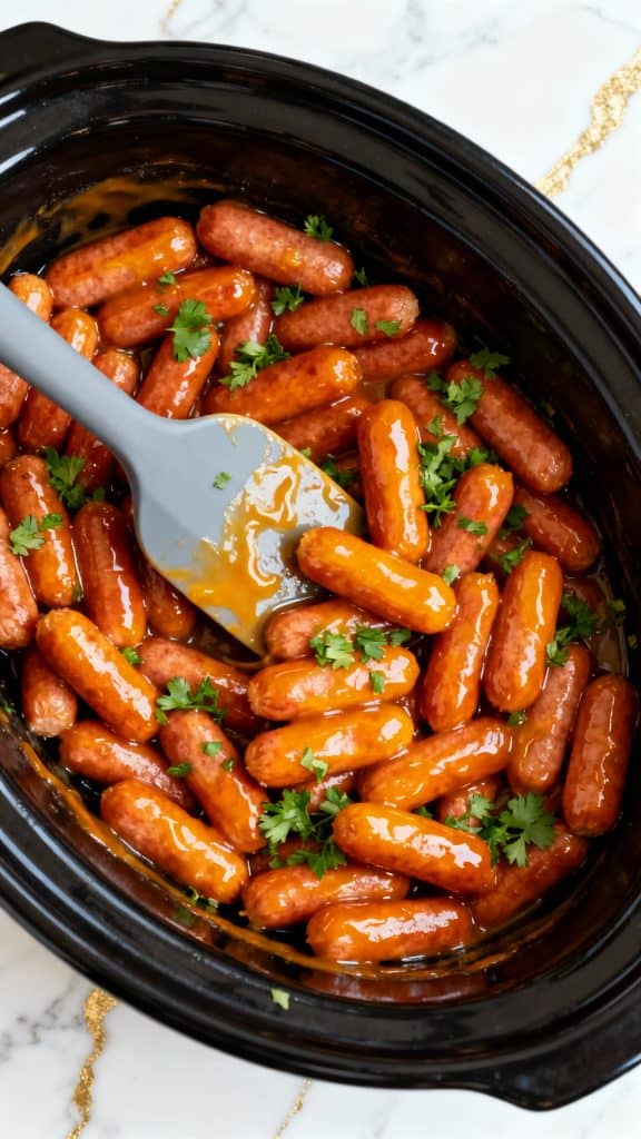 When done, uncover and stir again gently to fully coat the smokies in that thick, sticky sauce. If you’d like, sprinkle in a bit of chopped fresh parsley.