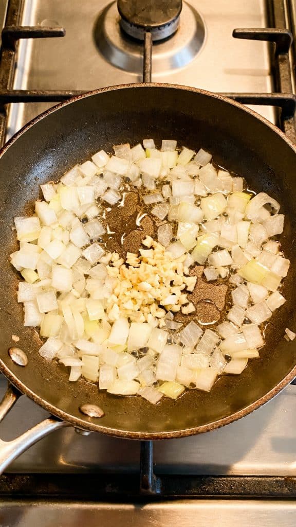 Heat 1 tablespoon olive oil in a frying pan. Add ¼ cup finely diced onion and 1 clove minced garlic. Sauté for 3–4 minutes until softened and fragrant.