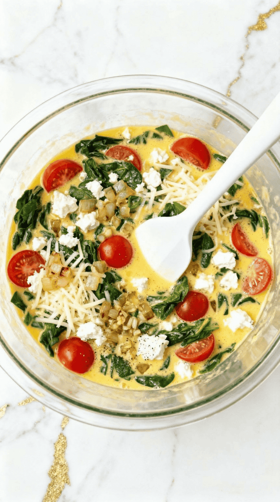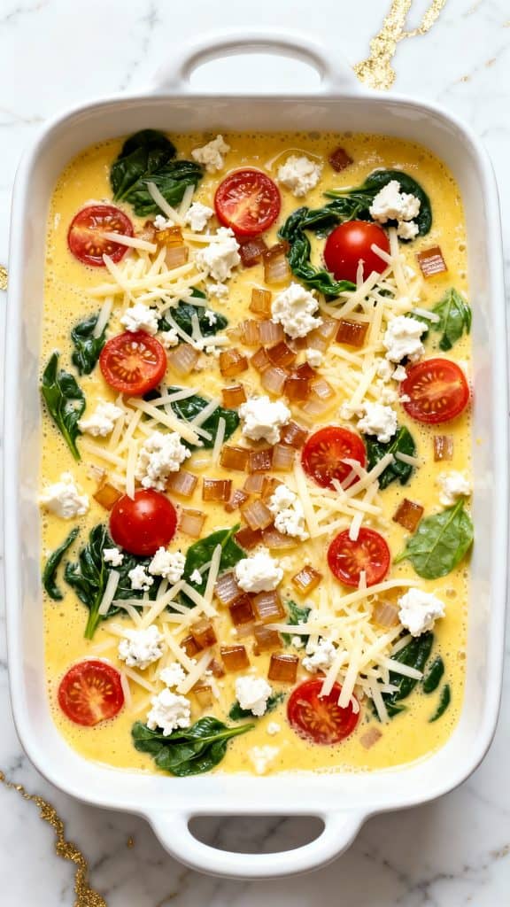 Eggs set into a firm texture thanks to the proteins unfolding and bonding when heated. Whole milk adds moisture and richness, while feta and mozzarella melt at different rates, giving both creamy and stretchy textures. The veggies add water, but the bake time ensures it sets without turning watery.