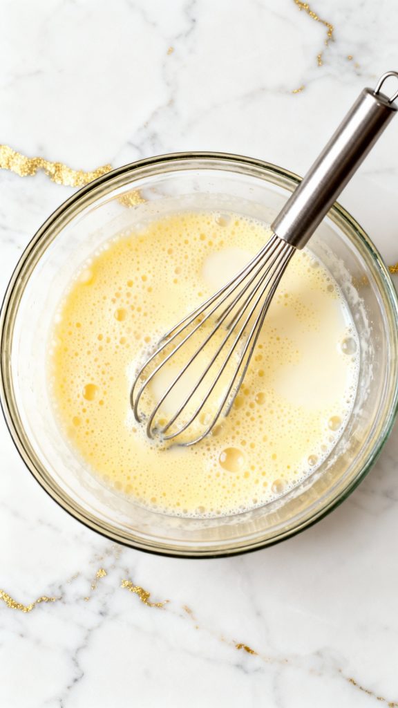 In a large mixing bowl, whisk together 8 large eggs and 1 cup whole milk until smooth.