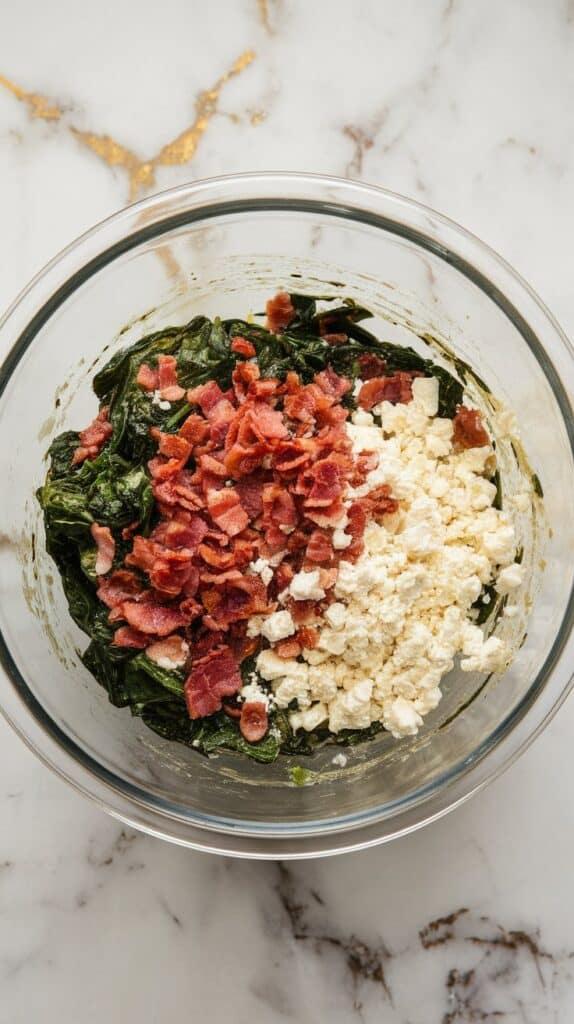 In a bowl, mix the sautéed spinach and garlic with the cooked bacon and ½ cup crumbled feta cheese. Stir gently to combine.