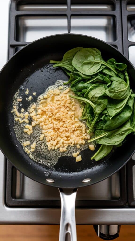 In the same skillet with some bacon fat, add 1 clove minced garlic and cook for 30 seconds. Add 2 cups roughly chopped spinach and cook until wilted, about 2 minutes.