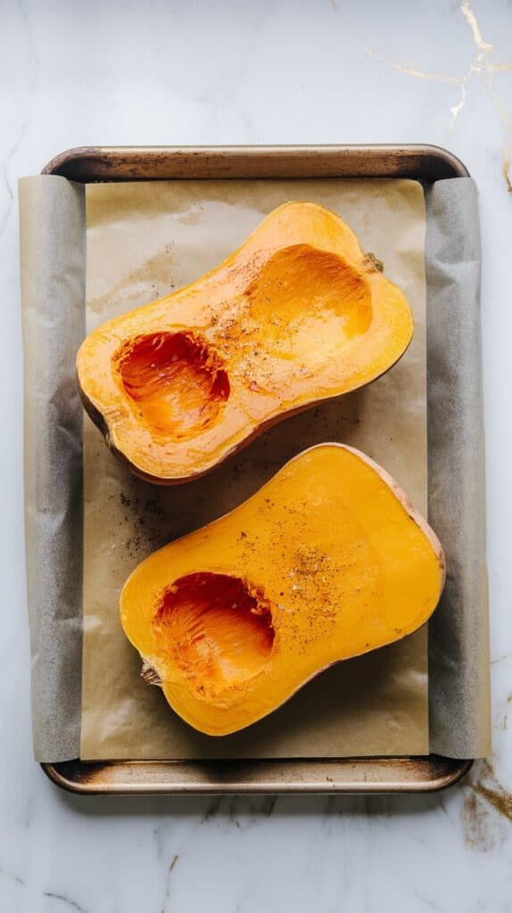 Brush the cut sides of 2 halved butternut squash with 1 tablespoon olive oil. Sprinkle evenly with ½ teaspoon salt and ¼ teaspoon black pepper. Place cut side down on a lined baking sheet and roast at 400°F for 40–45 minutes until fork-tender.