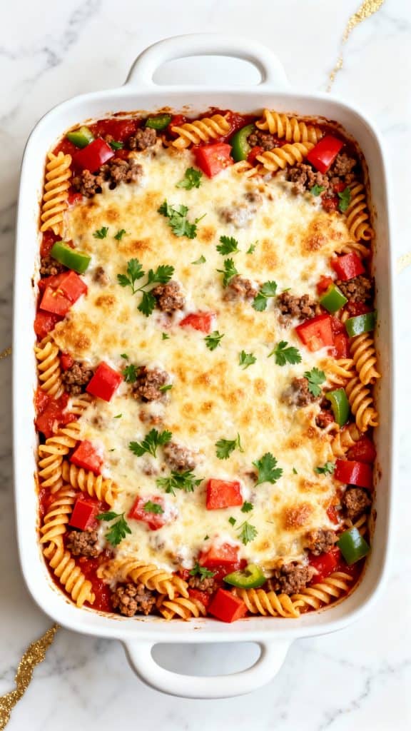It’s got all the flavors of classic stuffed peppers—juicy ground beef, tender bell peppers, melty cheese, and just the right seasonings—but mixed into cheesy pasta and baked to bubbly perfection. It’s simple, cozy, and always a hit.