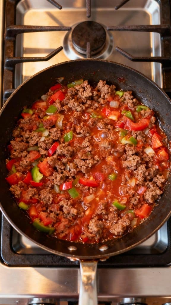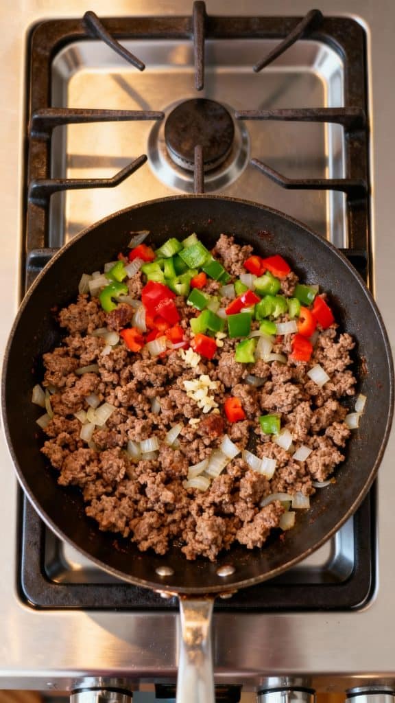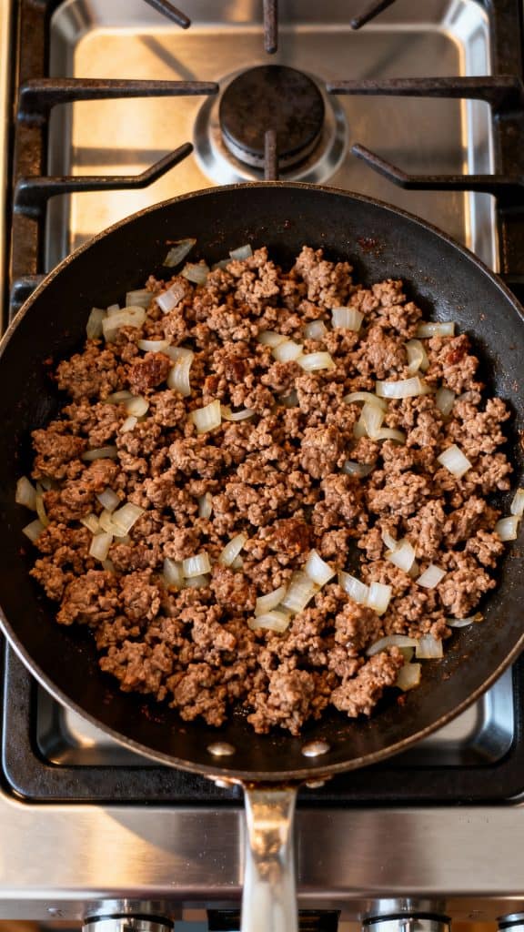 In a large skillet, heat 1 tablespoon olive oil over medium heat. Add 1 pound ground beef and 1 small diced onion. Cook until the beef is browned and the onion is soft, about 6-8 minutes.