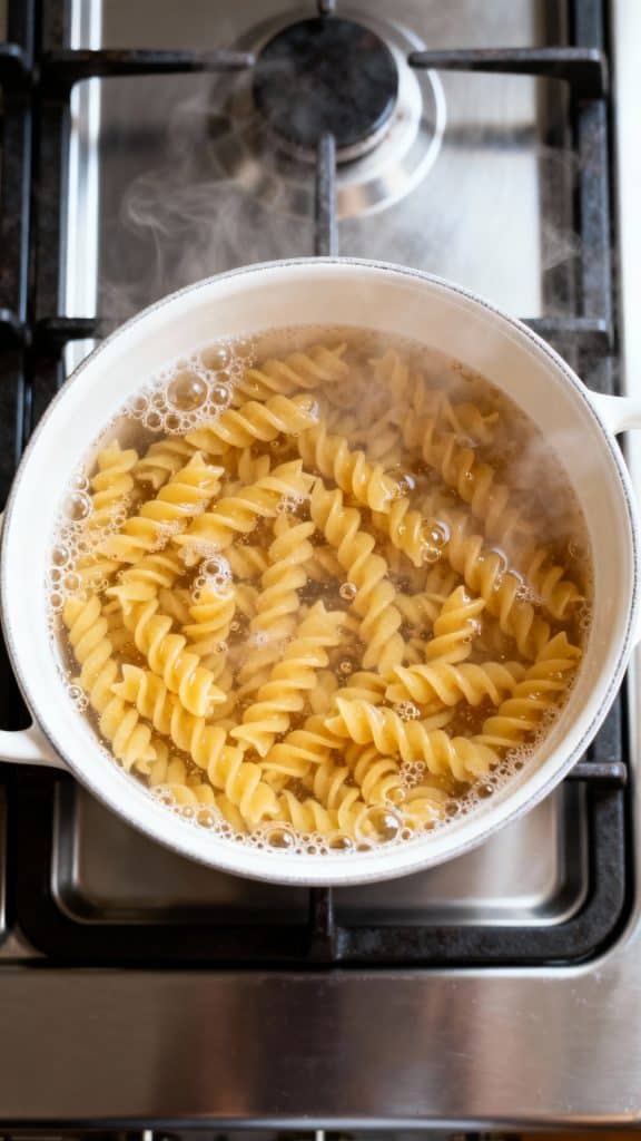Bring a medium pot of salted water to a boil. Add 2 cups dry rotini pasta and cook until just al dente, about 7-8 minutes. Drain and set aside.