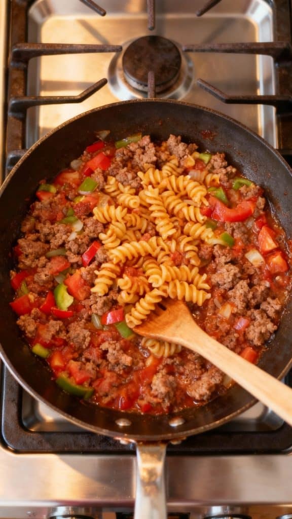 Turn off the heat. Add the drained rotini pasta and stir until everything is well combined.