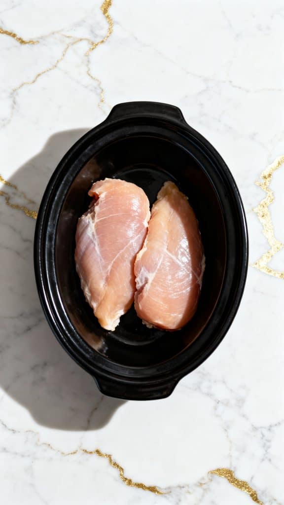 Place 2 lbs boneless, skinless chicken breasts in the crockpot.
