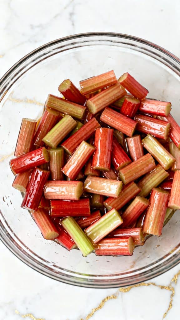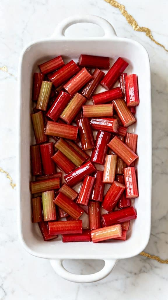 Spread the coated rhubarb into an even layer in the baking dish. Roast at 375°F for 20 to 25 minutes. Check it at 20 minutes. The rhubarb should look tender and juicy, with a bright pink syrup bubbling around it. You want the pieces soft but not completely falling apart.