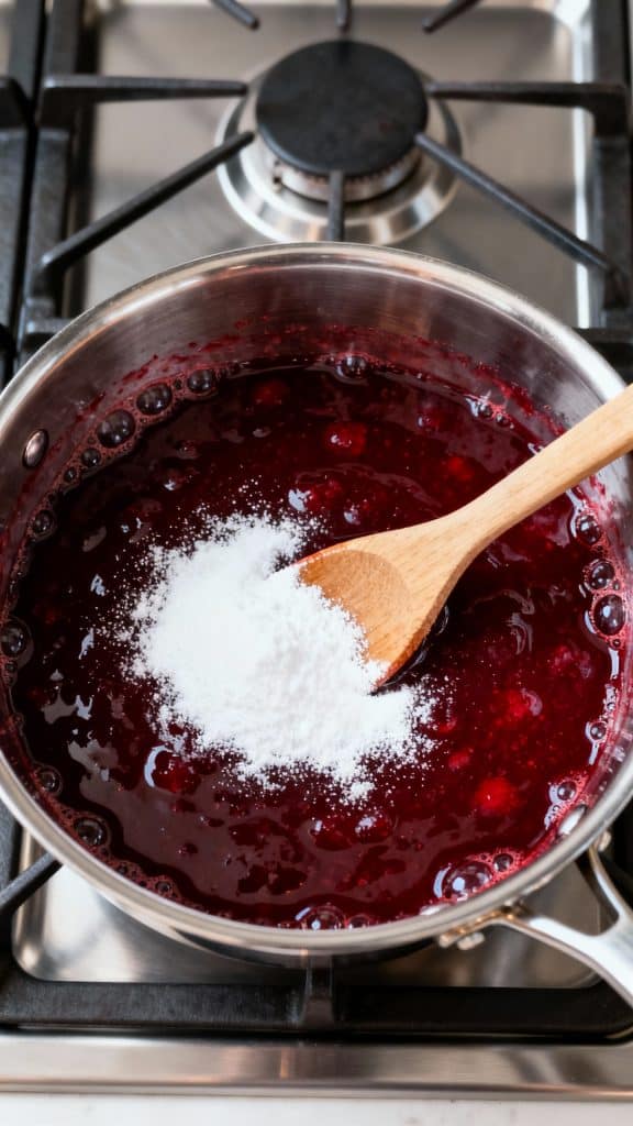 Sprinkle in 1 box of pectin while stirring constantly. Keep cooking for another 5 minutes until fully dissolved and mixture is thick.