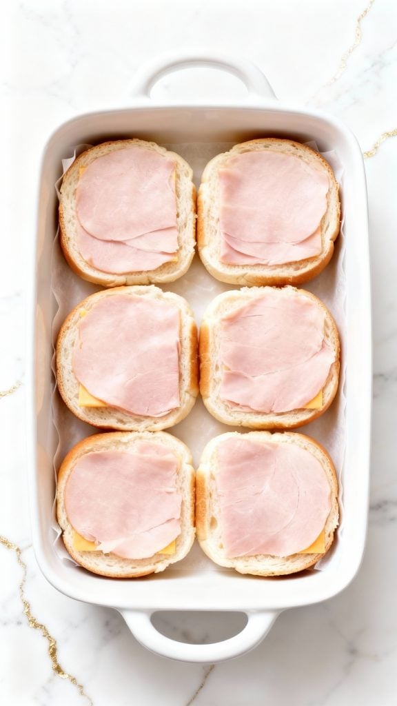 Use a serrated knife to cut the entire sheet of Hawaiian rolls in half horizontally. Don’t separate them. Place the bottom half into a 9×13 baking dish.