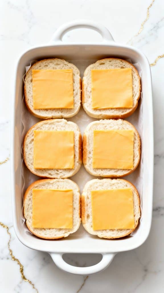 Place 6 slices of cheddar cheese evenly over the bottom half of the rolls.