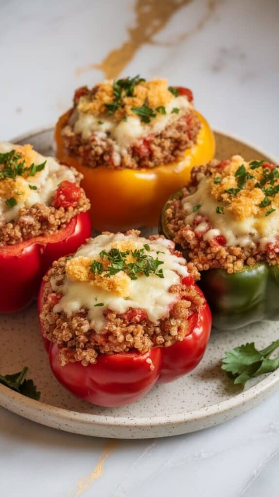 Sprinkle the remaining ½ cup mozzarella and ¼ cup breadcrumbs over the top. Bake at 375°F for 25–30 minutes until the peppers are tender and the tops are golden.
