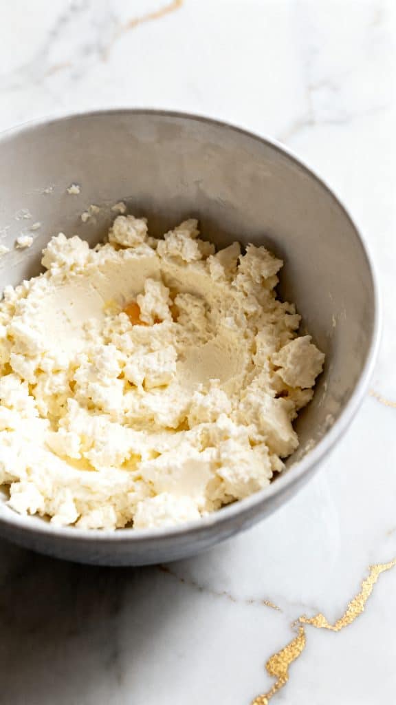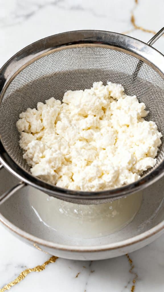 Put the 2 cups cottage cheese into a fine mesh strainer and let it drain for 10 to 15 minutes. If it still looks wet, press it gently with the back of a spoon. You want it thick and fairly dry so the filling stays creamy instead of watery.