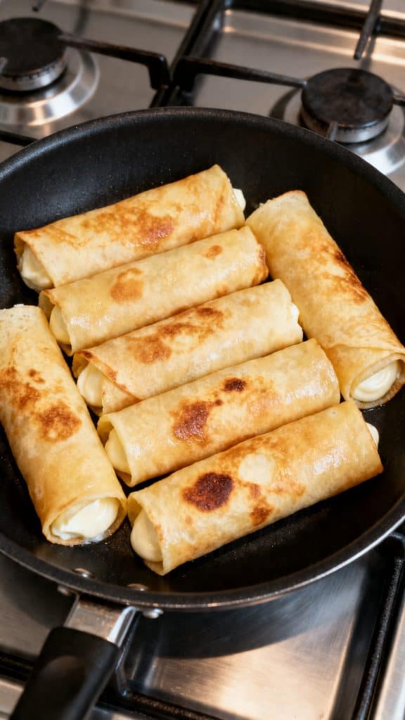 Heat the skillet again over medium-low heat on a modern stainless steel gas stove. Add 2 tablespoons melted unsalted butter. Place the filled crepes seam-side down in the skillet and warm them for about 1 to 2 minutes per side, just until lightly golden in spots and heated through.