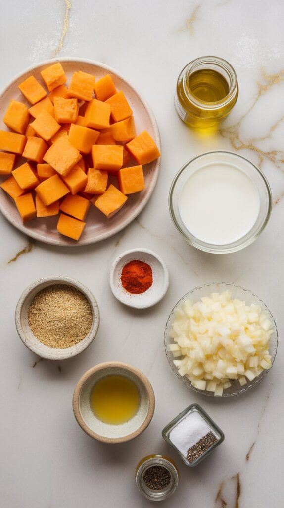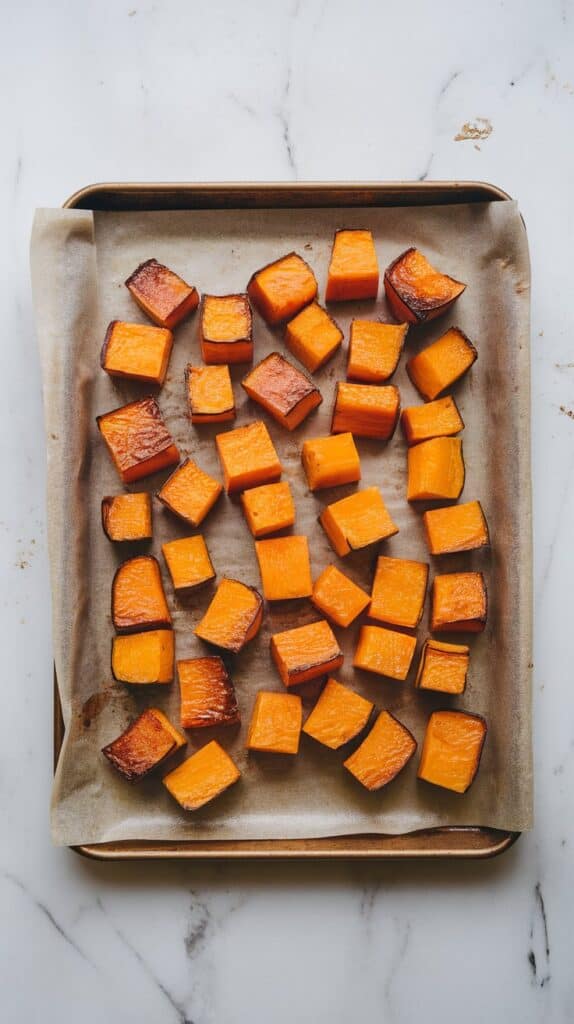 Preheat your oven to 400°F (200°C). Toss 3 cups of diced butternut squash with 1 tablespoon olive oil, ½ teaspoon kosher salt, and ¼ teaspoon black pepper. Spread it on a parchment-lined baking sheet and roast for 25–30 minutes until soft and golden on the edges.