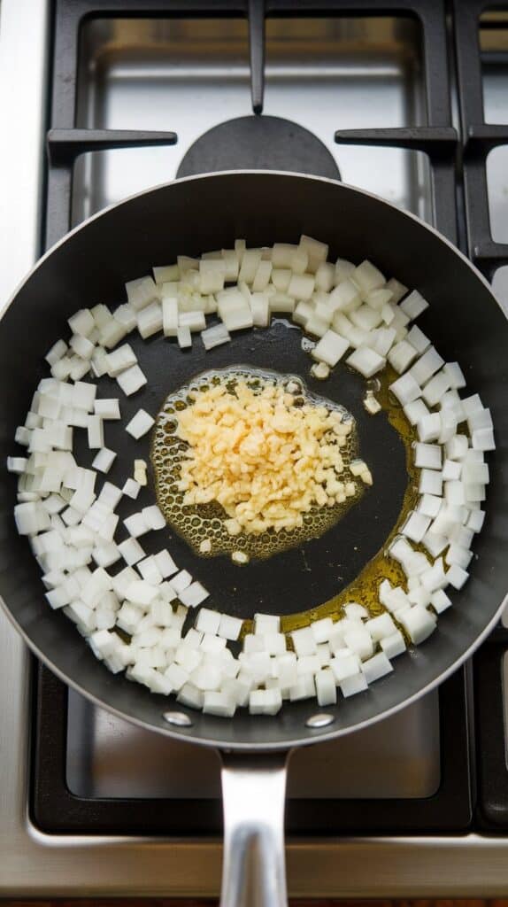 In a skillet over medium heat, add 1 tablespoon olive oil. Once hot, add 1 small diced yellow onion and cook for 4–5 minutes until soft. Add 3 minced garlic cloves and cook for another minute, just until fragrant.