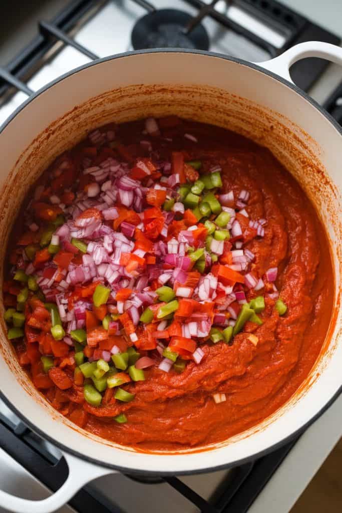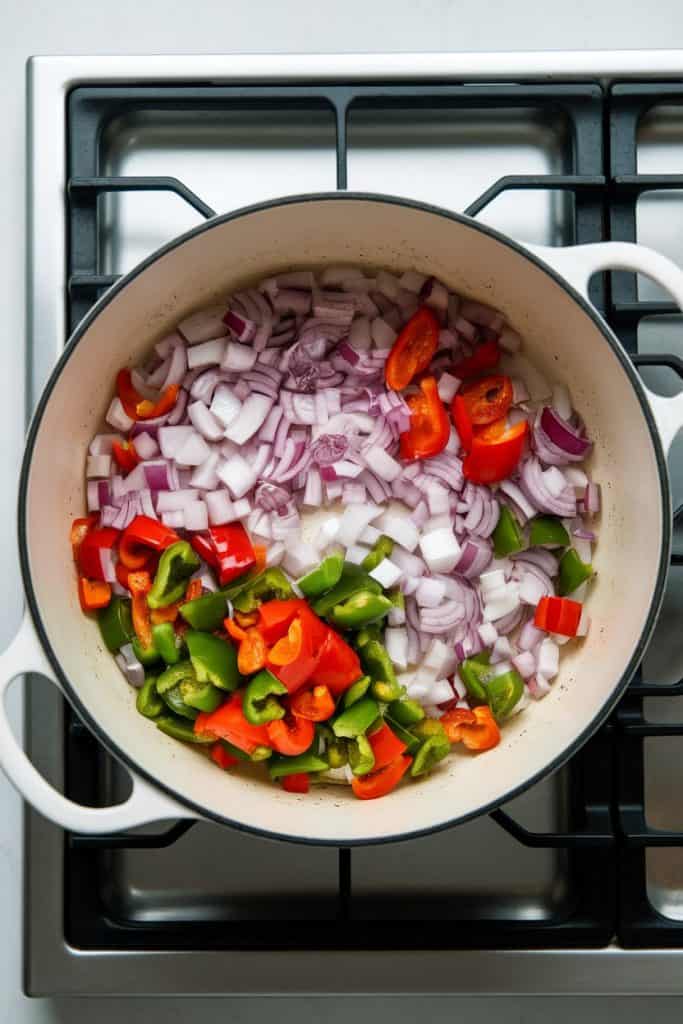 In a large pot, heat 1 tablespoon olive oil over medium heat. Add 1 diced red onion, 1 diced red bell pepper, and 1 diced green bell pepper. Cook for 5–6 minutes, until softened.