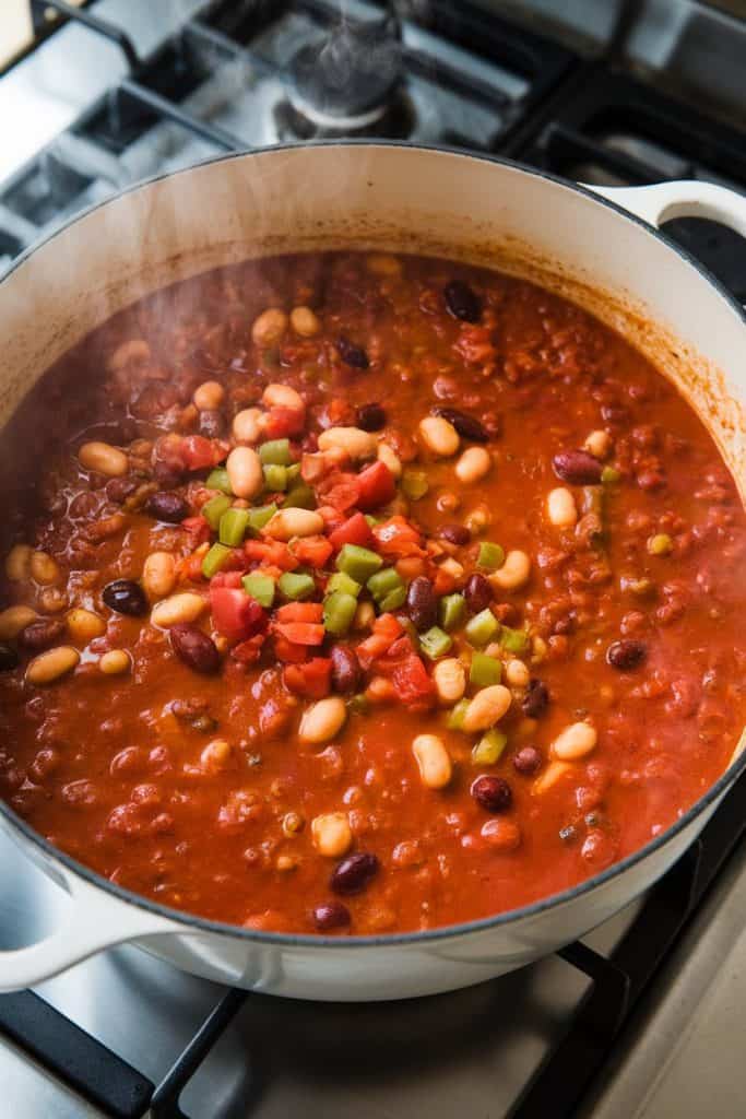 Toasting the spices with the tomato paste brings out deep, rich flavor. The combination of three different beans adds variety in texture and protein. Simmering helps everything blend together into one thick, flavorful pot of chili.