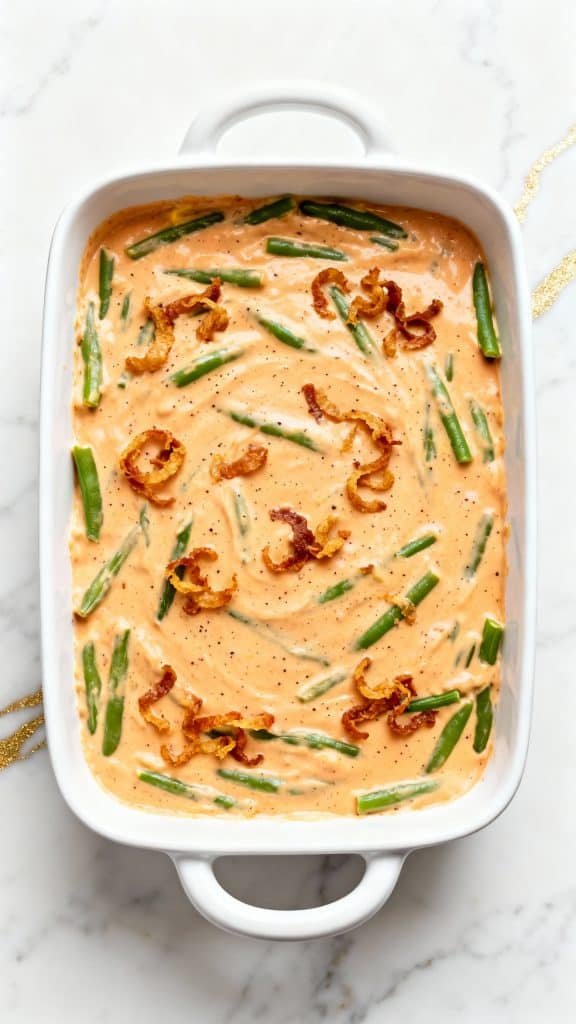 Velveeta melts smoother than most cheeses because it’s made with emulsifiers. This keeps the sauce creamy and prevents it from splitting. The starches in the mushroom soup help thicken the base and coat the green beans evenly. Crispy onions add that perfect contrast—crunch on top, creamy underneath.